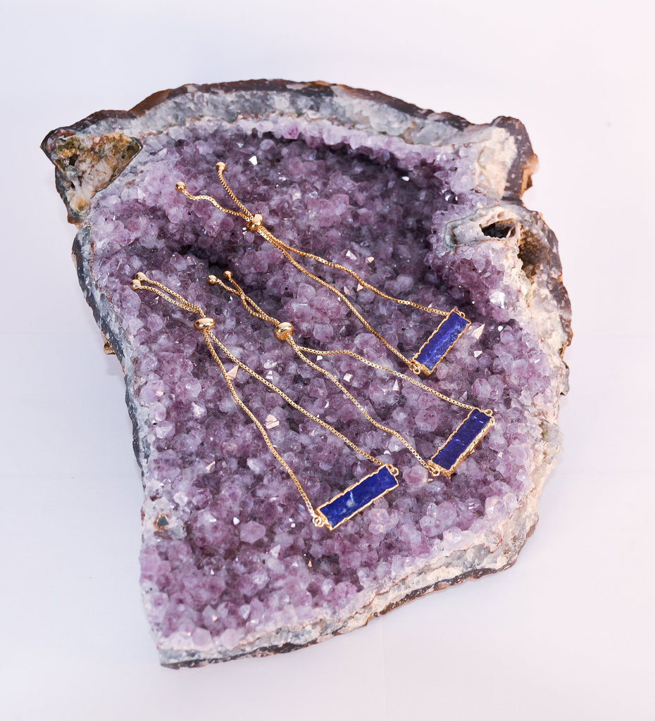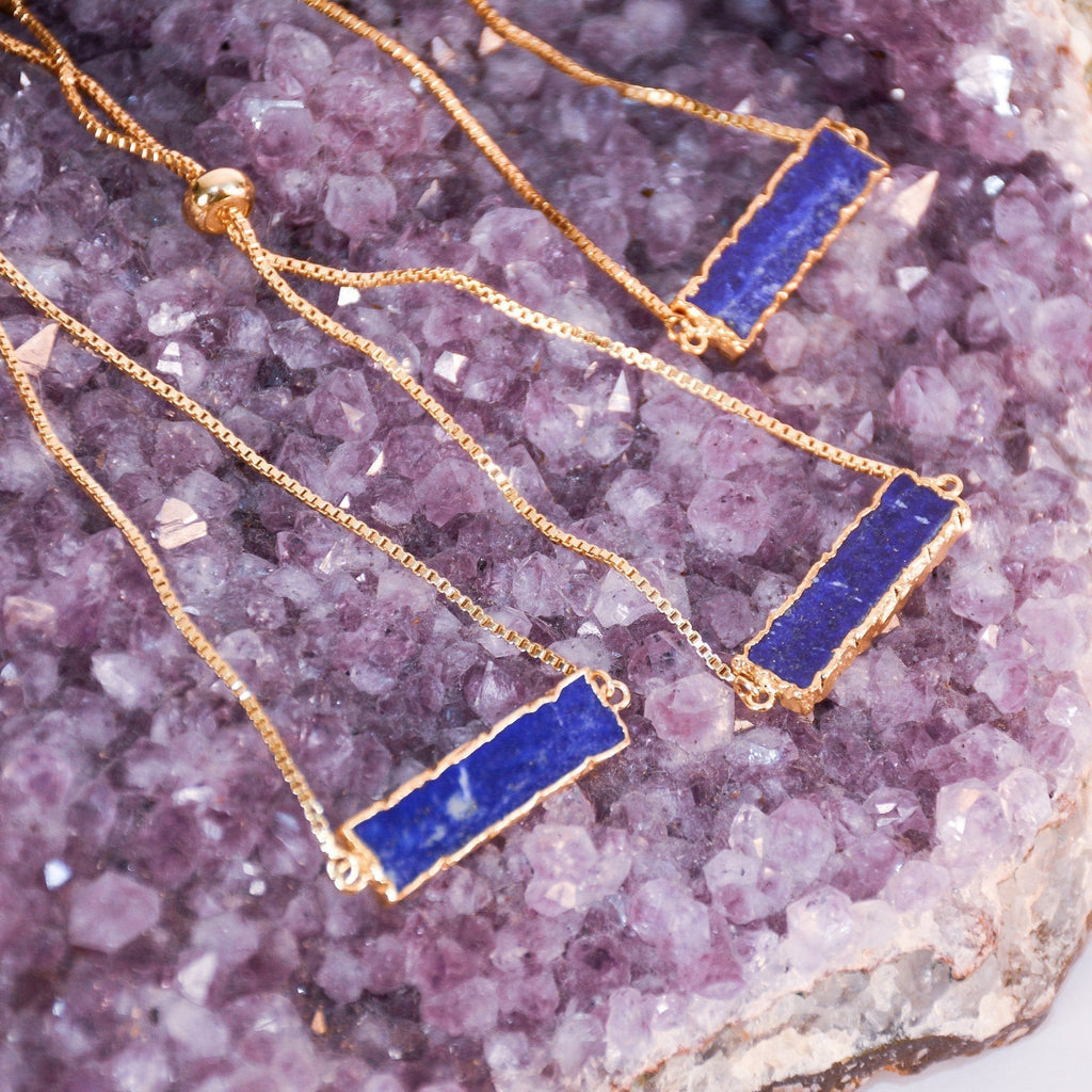 Sometimes mother nature gets it SO right all she needs is a platform to shine. Enter this sultry lapis lazuli bracelet in gold. Each piece includes a stunning polished piece of lapis lazuli on an adjustable 24k gold plated bolo pull chain that allows for it to fit every size wrist out there. Honestly, from little kids to adult man wrists. It's a bracelet for EVERYONE!