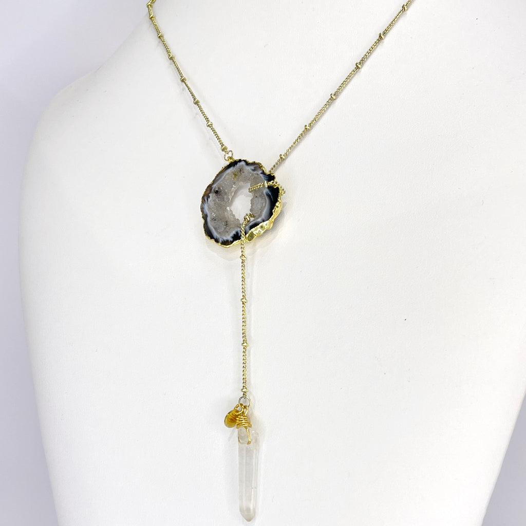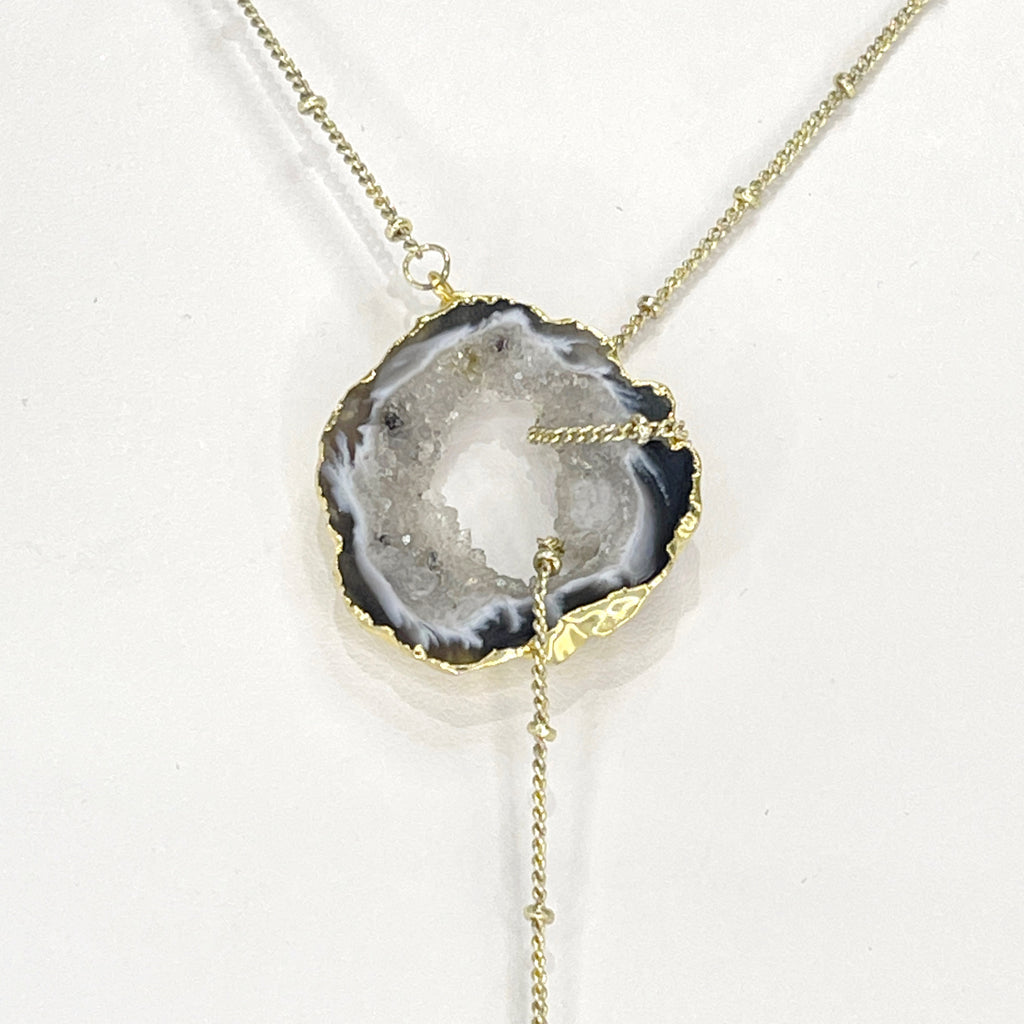Elegant and eye catching, celebrate the perfectly imperfect magic of mother nature with this silver geode slice lariat. Designed to be lightweight and a statement at the same time. Ideal for so many occasions!