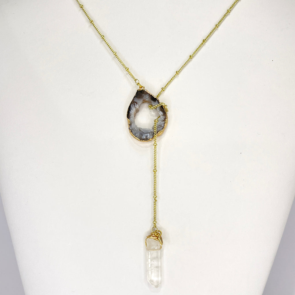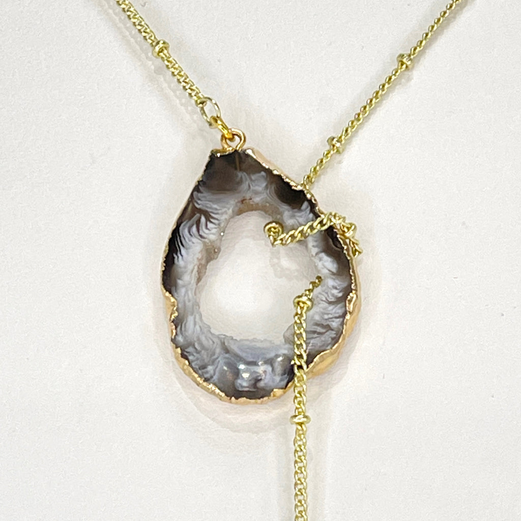 Elegant and eye catching, celebrate the perfectly imperfect magic of mother nature with this silver geode slice lariat. Designed to be lightweight and a statement at the same time. Ideal for so many occasions!
