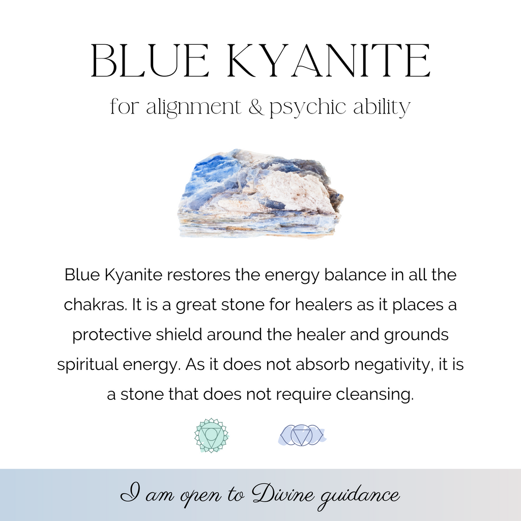 Kyanite is an excellent stone for meditation. It will not retain negative vibrations or energy, which means it never requiring clearing. Kyanite aligns all chakras and subtle bodies instantly. It provides balance of yin-yang energy, moving energy gently through the physical body.