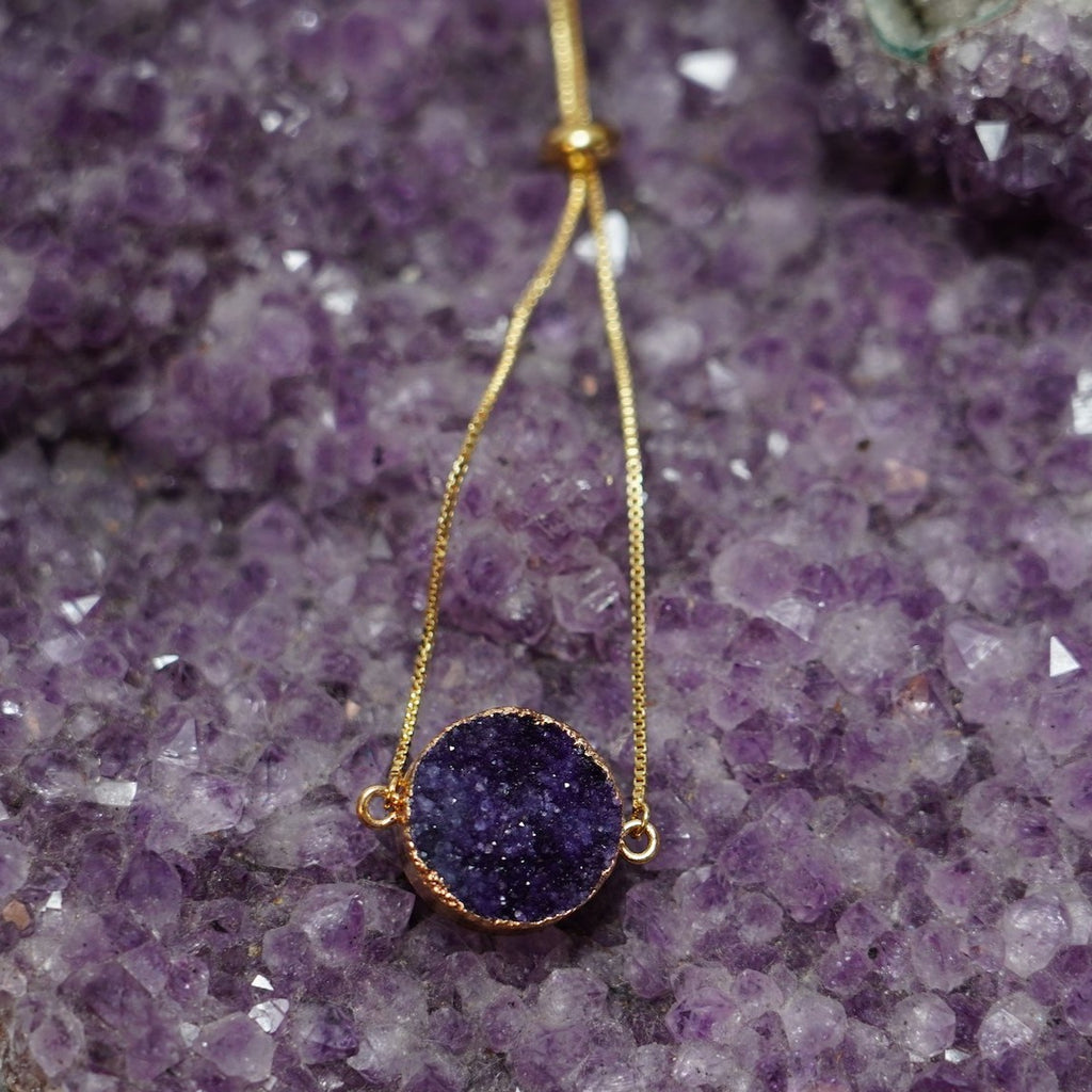 Each piece includes a round shaped druzy on an adjustable 24k gold plated bolo pull chain that allows for it to fit every size wrist out there. Honestly, from little kids to adult man wrists. It's a bracelet for EVERYONE!